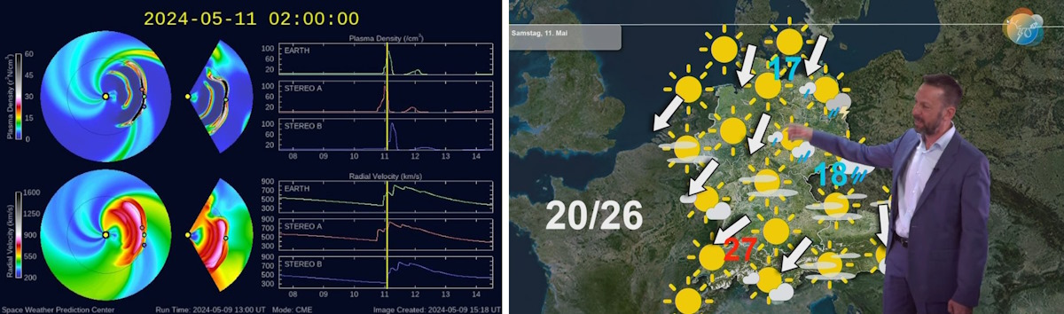Zu diesem Zeitpunkt durften wir auf drei CME mit Volltreffer am Wochenende 10.-12. Mai hoffen. Aber die Sonne hat nicht aufgehört! Die zwei zeitgleich eintreffenden CME waren nur der Anfang. Insgesamt machten sich in relativ kurzer Zeit sechs CME auf den Weg zu uns. Daher hatte dieses Ereignis eine ungewöhnlich lange Dauer, denn der von den ersten beiden Eruptionen ausgelöste Sonnensturm wurde durch die weiteren Eruptionen in den kommenen Stunden und Tagen auf hohem Level gehalten.