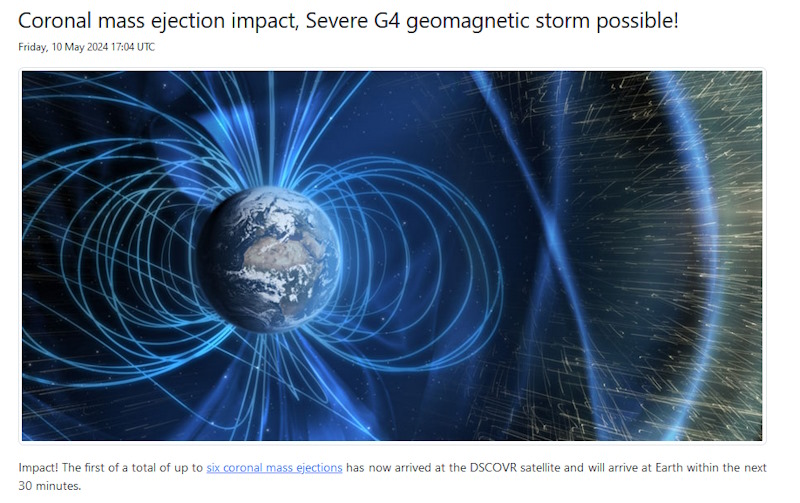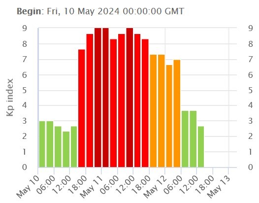 Alles deutete also bis hier darauf hin, dass etwas wirklich richtig und sowas von Dickes auf uns zukommt. Unterdessen hatte NOAH die zu erwartende Stärke des kommenden Sonnensturmes mit G3 (dritte von fünf G-Stufen) vorhergesagt. Das war eher konservativ, wie wir heute wissen. Sogar die ansonsten sehr vorsichtige NASA prognostizierte im Laufe des Freitagvormittags die Auswirkungen des Sturms mit S4, der zweithöchsten Stufe von Auswirkungen, die ein Sonnensturm haben kann. Außerdem war bereits Kp 8 vorhergesagt.
